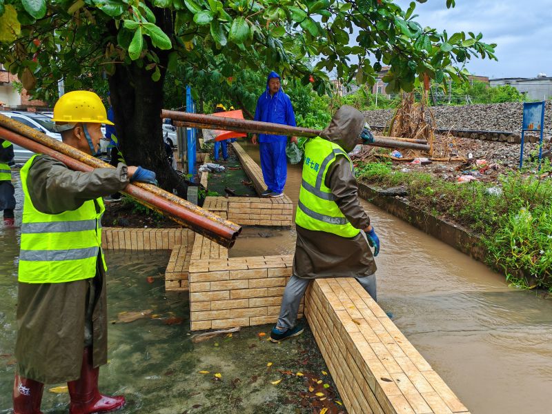 得知广茂铁路茂名段一区段被洪水围困,铁路路堤多处存在坍塌风险,客货运列车全部停运的消息后,广湛铁路八标项目部立即启动抢险救援应急预案,组织50余名抢险队员,成立“党员先锋队”“青年突击队”,携带钢管、编织袋、发电机、钢筋网片、彩条布等抢险物资,立即赶往30公里外的出险区段。抢险地段位于村庄低洼处,现场积水较深形成水塘,道路狭窄泥泞,大型设备无法进入,运输极其困难。抢险人员不惧艰辛,卷起裤腿,毫不犹豫跳进积水中,肩扛手抬把抢险物资运至路堤上,举刀挥锹砍伐路堤两侧的杂树,组织抢险人员采取人工打钢管桩、堆码沙袋的加固措施,对滑坡路堤进行加固。